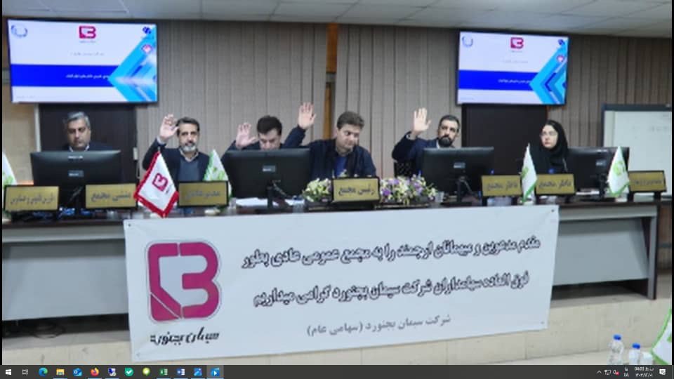 مجمع عمومی عادی به طور فوق العاده شرکت سیمان بجنورد در سال مالی منتهی به 30 اسفند 1403، با حضور 87.71 درصد از سهامداران حقیقی و حقوقی، نماینده سازمان بورس و اوراق بهادار، نماینده حسابرس مستقل و بازرس قانونی و اعضای هیات مدیره شرکت، راس ساعت 10:00 روز چهار شنبه مورخ 01/12/1403 در محل خيابان شهيد بهشتي ، خيابان خالد اسلامبولي ( وزرا ) ، کوچه نهم ، پلاک 22 طبقه دوم سالن جلسات ساختمان انجمن صنفي صنعت سيمان برگزار گردید .